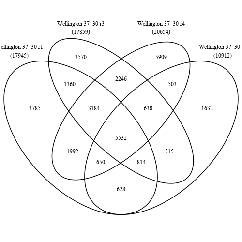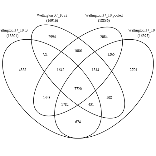 Venn Diagrams for 37C 10min without outlier replicate (r4) and with results for pooled replicates: